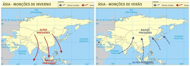 A ocorrência de monções se deve ao fato de que as terras continentais aquecem-se e esfriam mais rapidamente do que as águas oceânicas. Durante o verão, o interior da Ásia, ao esquentar-se, forma uma área de baixa pressão, que contrasta com as altas pressões dos oceanos, provocando o deslocamento de ventos úmidos do mar para a terra. Esses ventos são as monções de verão. Nas monções de inverno ocorre exatamente o inverso: os oceanos estão mais quentes do que o continente, formando áreas de baixa pressão e atraindo os ventos continentais.